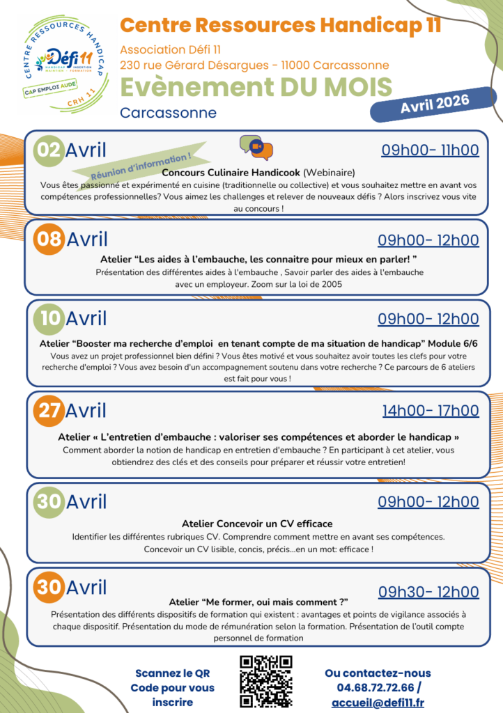 L’association Défi 11 / Cap emploi 11 a mis en place leCentre Ressource Handicap 11afin de favoriser l’insertion professionnelle des personnes en situation de handicap.
