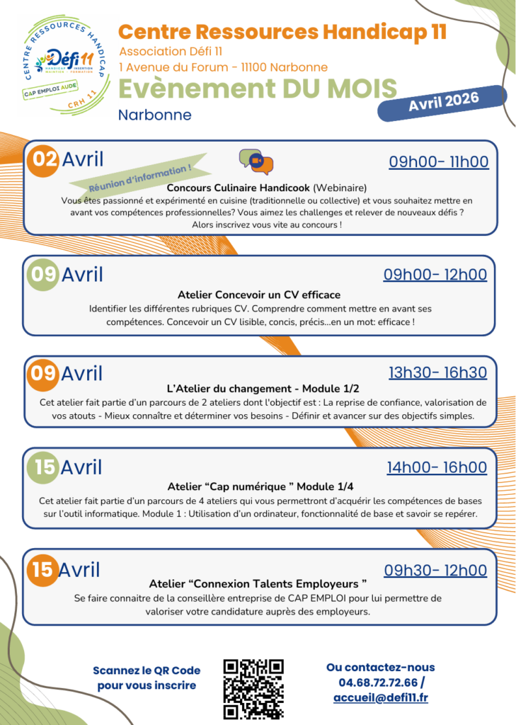 Retrouvez ci-dessous le programme des ateliers proposés pendant le mois d’avril 2026 et auxquels vous pouvez vous inscrire.avril